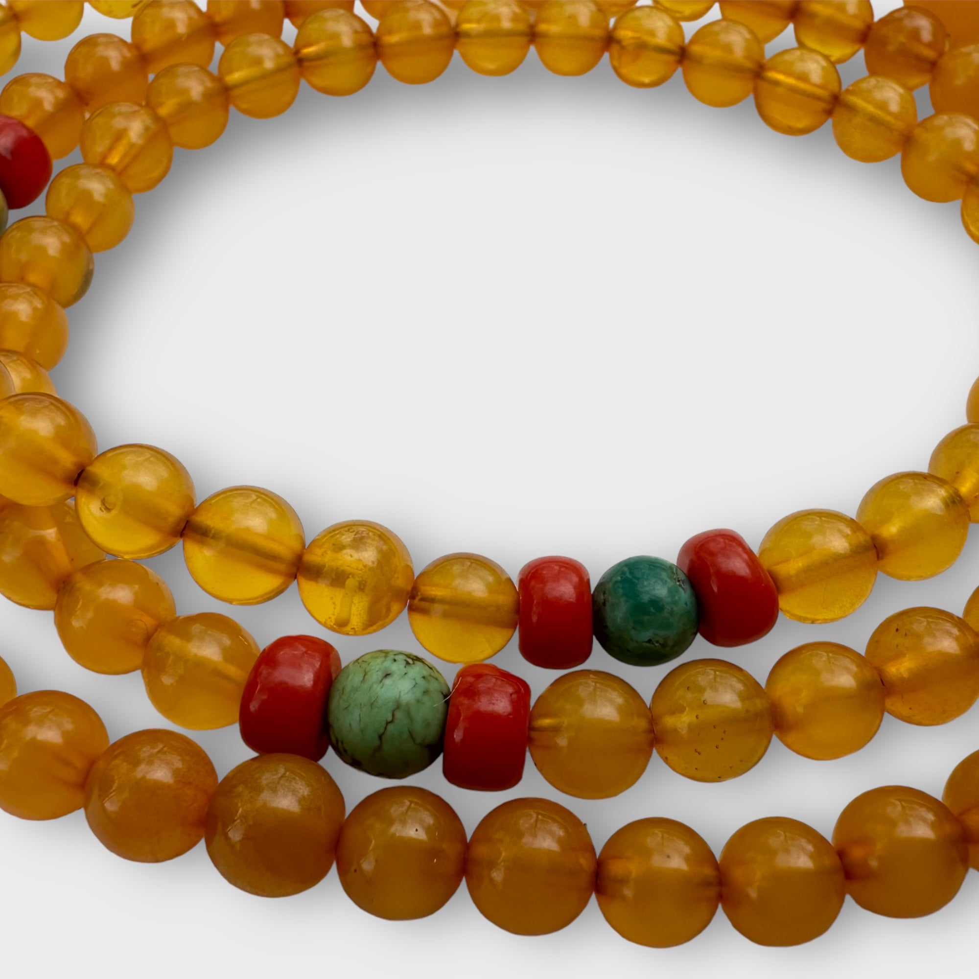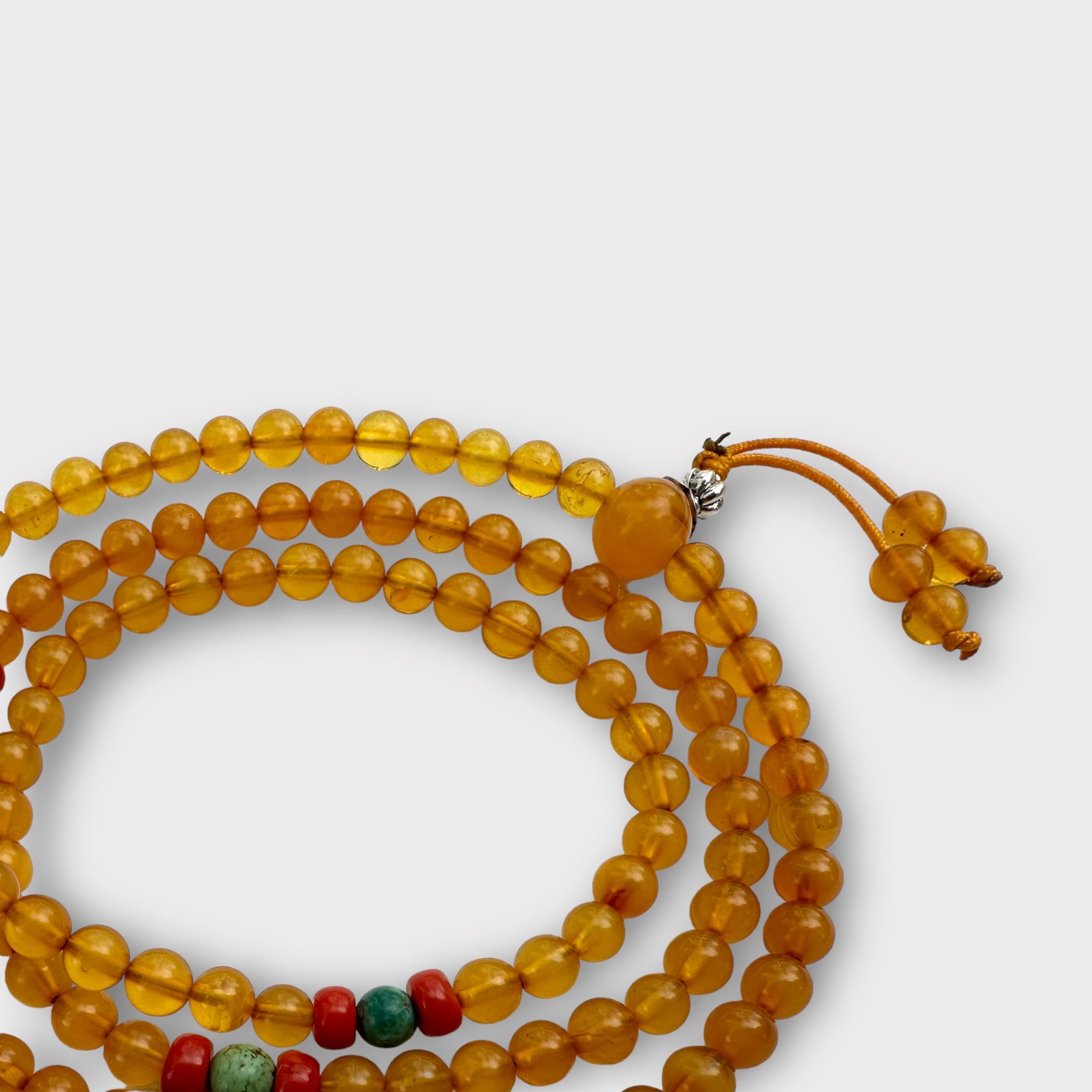 Immerse yourself in the healing energy of our Natural Baltic Amber Mala, accented with coral and turquoise spacers. Each 6mm amber bead is renowned for its soothing and cleansing properties, promoting calmness, alleviating stress, and attracting positive energy. Combined with coral, known for its ability to restore harmony and vitality, and turquoise, celebrated for its protective and balancing qualities, this Mala is a powerful tool for your spiritual practice.