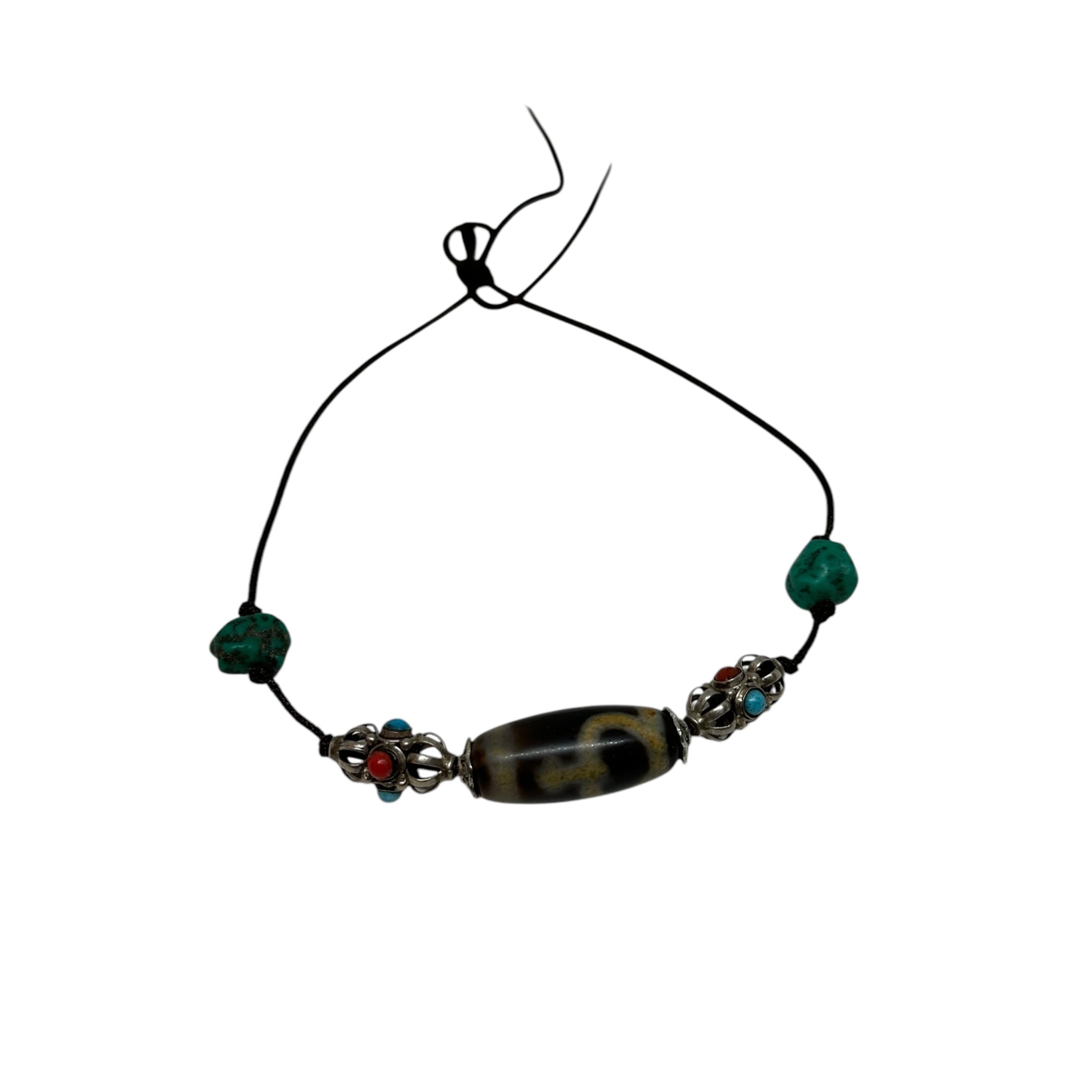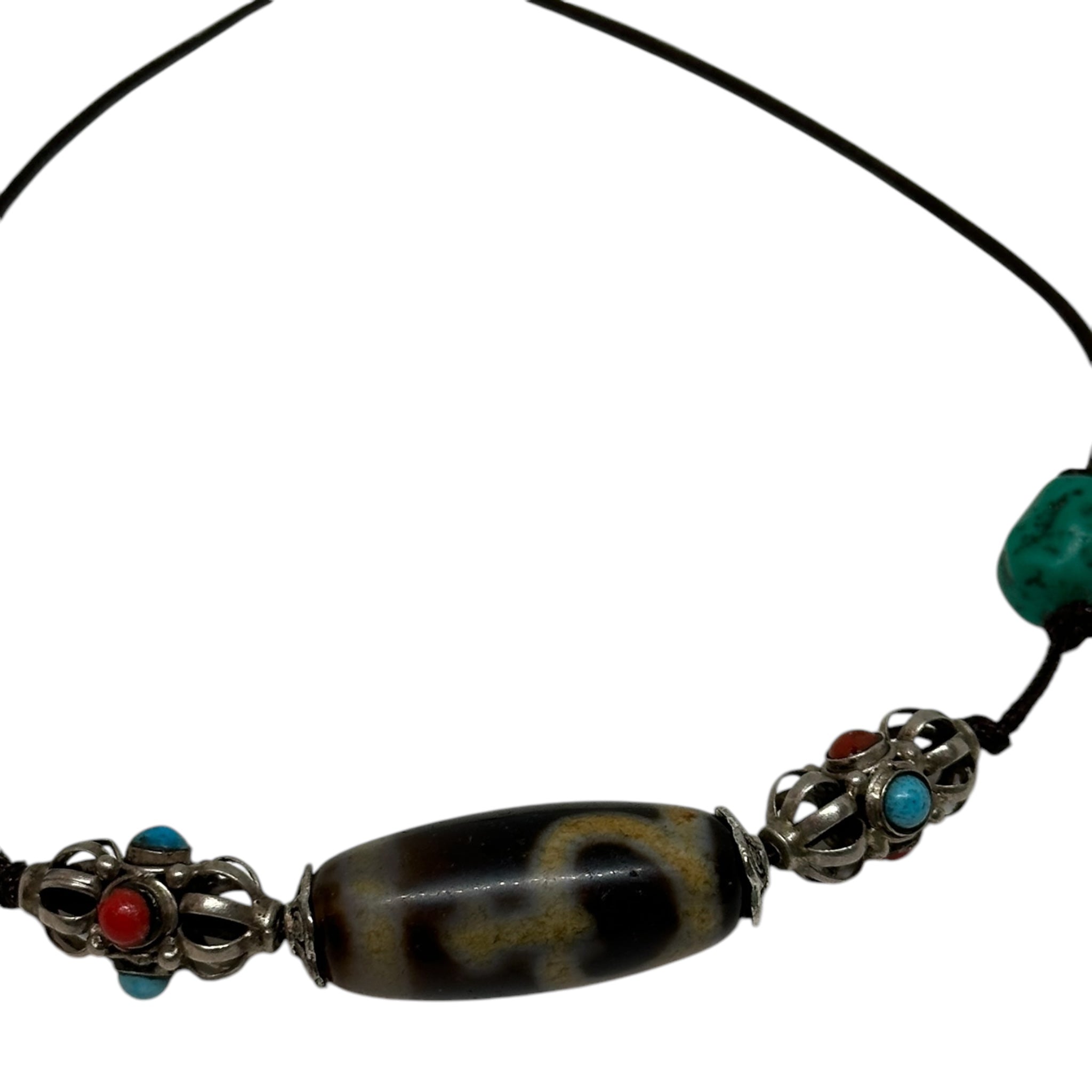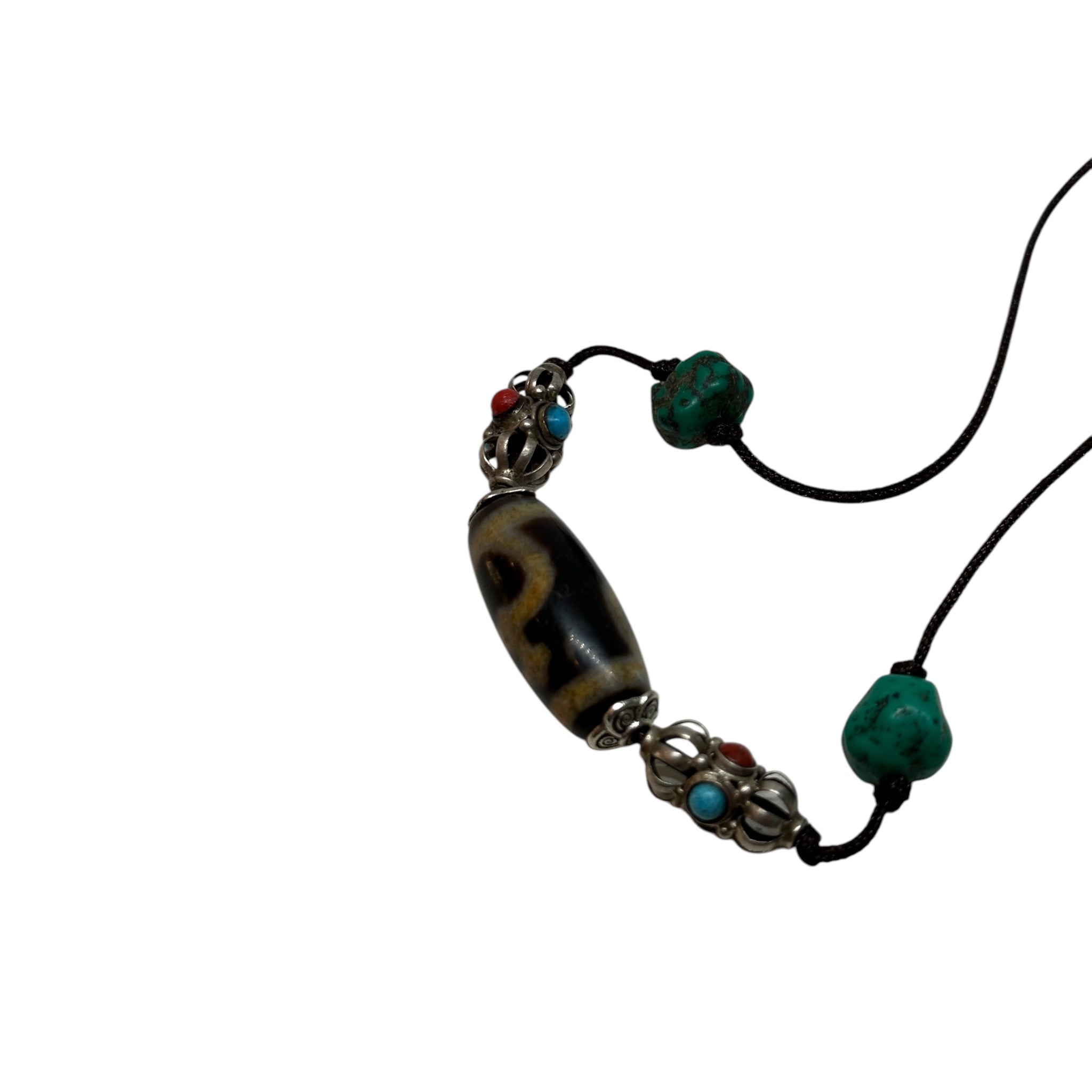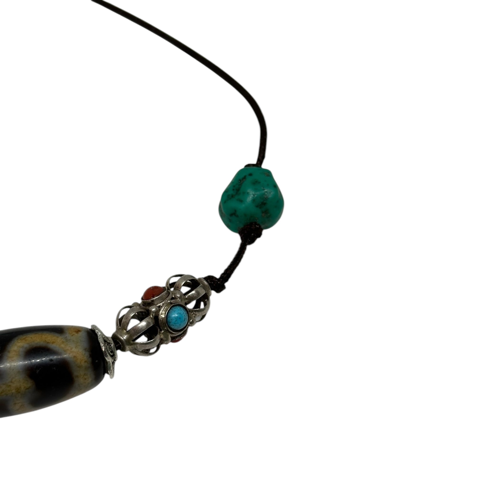 The dzi stone, revered as a powerful amulet in Himalayan culture, is known to bring protection, good fortune, and balance to its wearer. Each element, from the aged turquoise to the meticulously carved Vajra, highlights traditional Tibetan craftsmanship and carries deep spiritual significance.